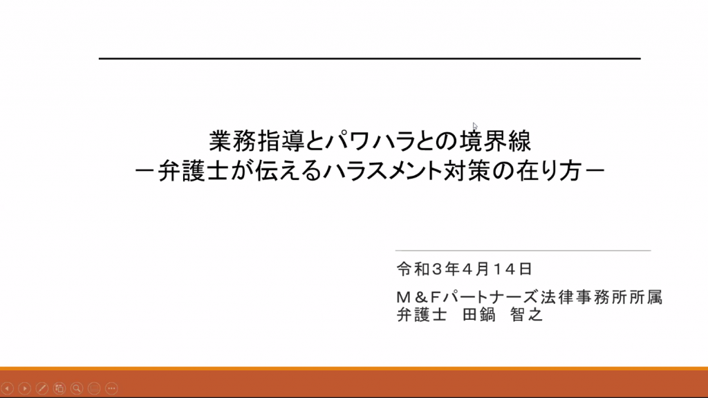 2021年4月14日に所属するコンサルタント向けに、当協会の田鍋弁護士から実際の事例を利用して、「弁護士が伝えるハラスメント対策」についてセミナーを開催しました。